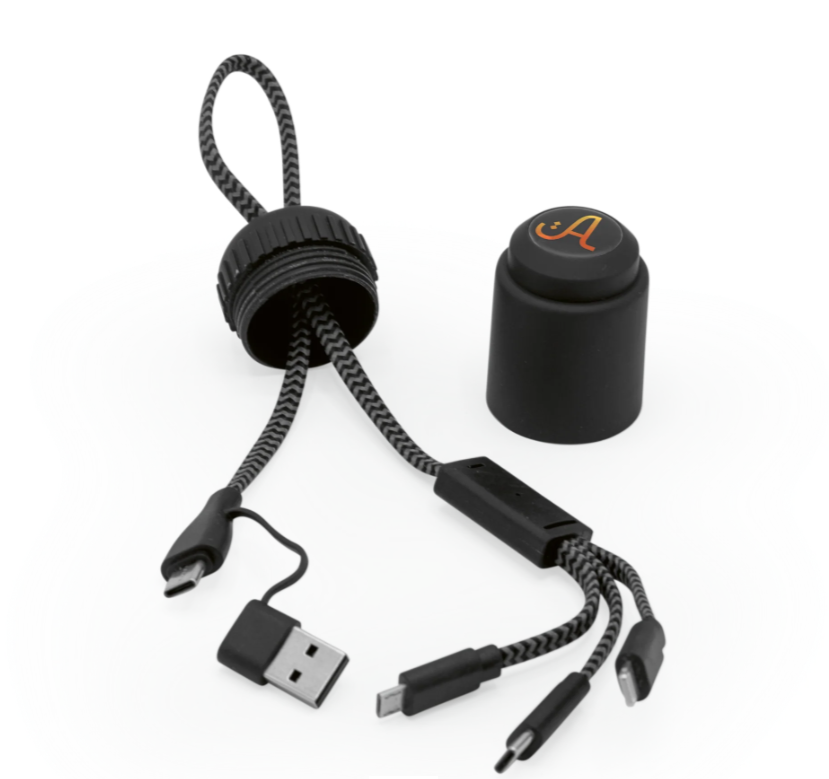 Say farewell to cable chaos with our sleek, portable cord. This pocket-sized powerhouse features the following connectors: two USB-C, one USB-A, one Micro USB, and one iOS-Compatible cable, all neatly wrapped in a stylish tube.